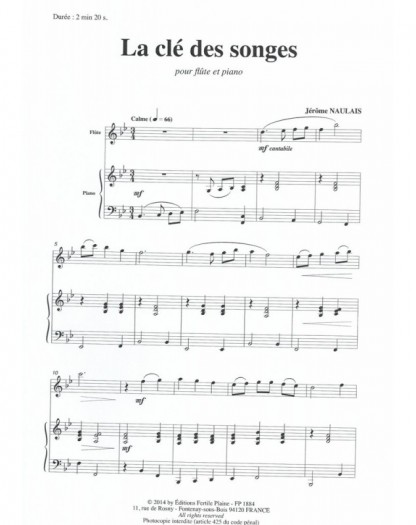 La Clé Des Songes Jérôme Naulais Flûte Traversière et Piano Recueil + Partition