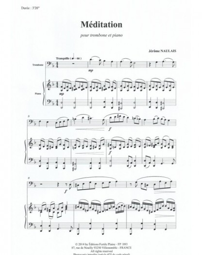 Méditation Jérôme Naulais Trombone et Piano Recueil + Partition
