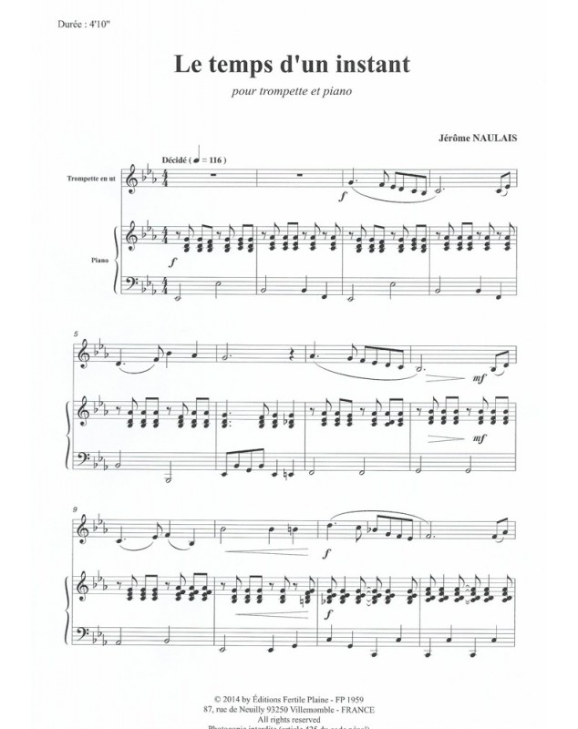 Le Temps D'un Instant Jérôme Naulais Trompette et Piano Recueil + Partition