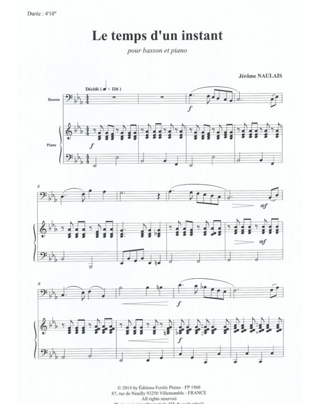 Le Temps D'un Instant Jérôme Naulais Basson et Piano Recueil + Partition