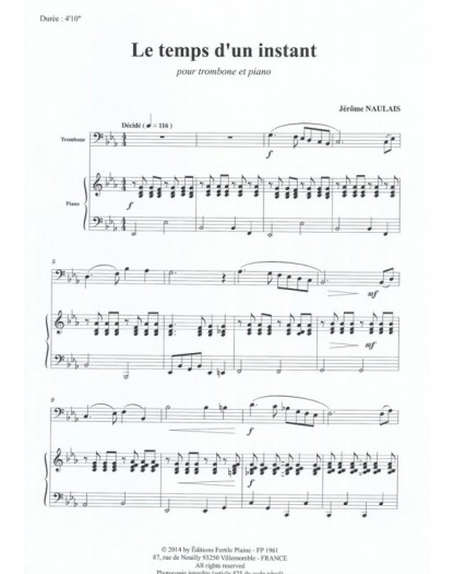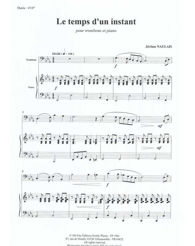 Le Temps D'un Instant Jérôme Naulais Trombone et Piano Recueil + Partition
