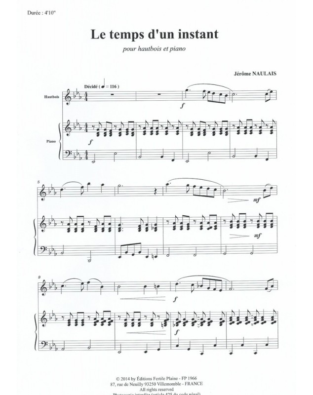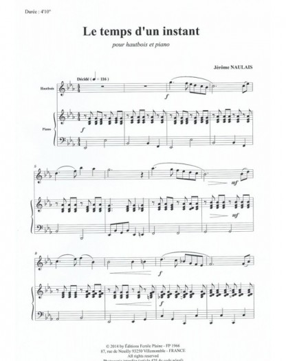Le Temps D'un Instant Jérôme Naulais Hautbois et Piano Recueil + Partition