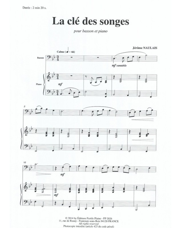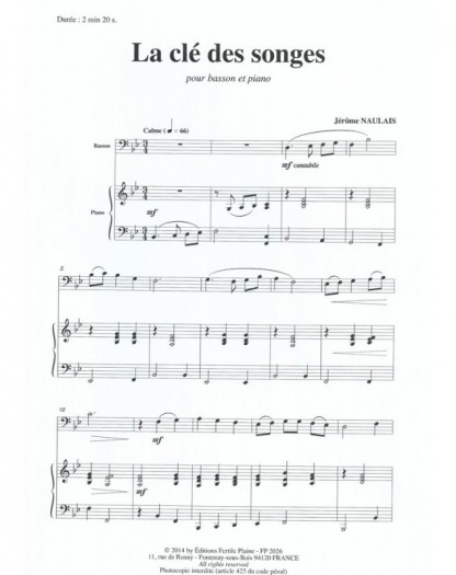 La Clé Des Songes Jérôme Naulais Basson et Piano Recueil + Partition