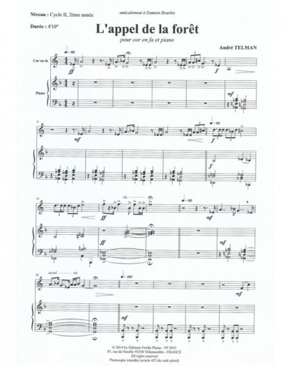 L'appel De La Forêt André Telman Cor et Piano Recueil + Partition