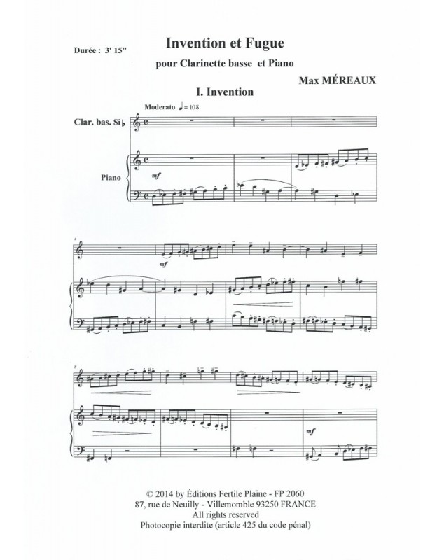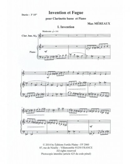 Invention et Fugue Max Mereaux Bass Clarinet and Piano Recueil + Partition