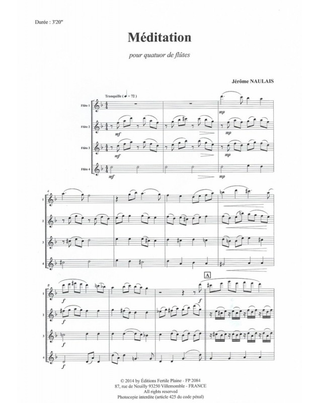 Méditation, Jérôme Naulais 4 Flûtes Traversières Set de partitions