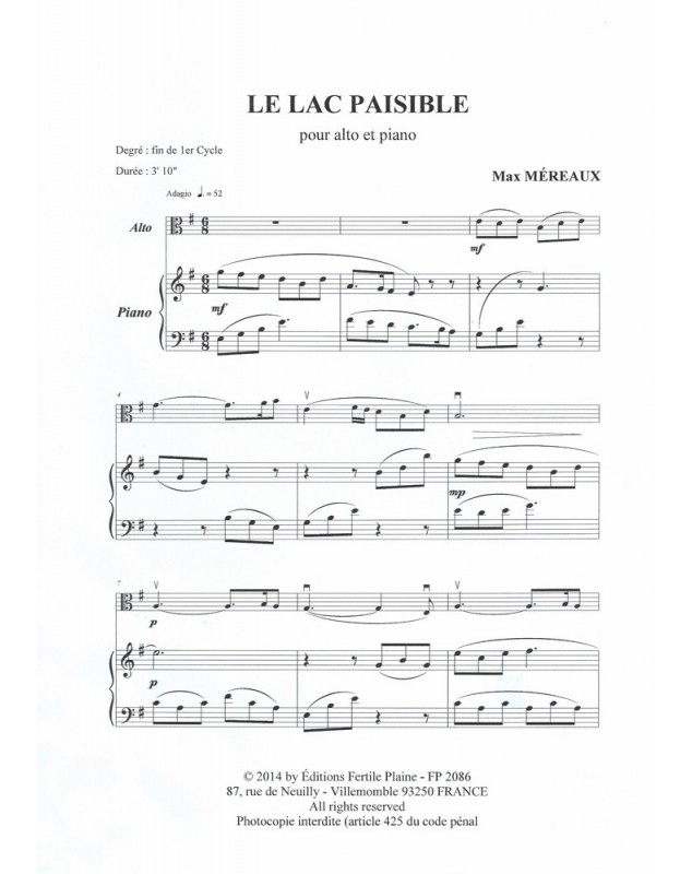 Le Lac Paisible Max Mereaux Alto et Piano Recueil + Partition