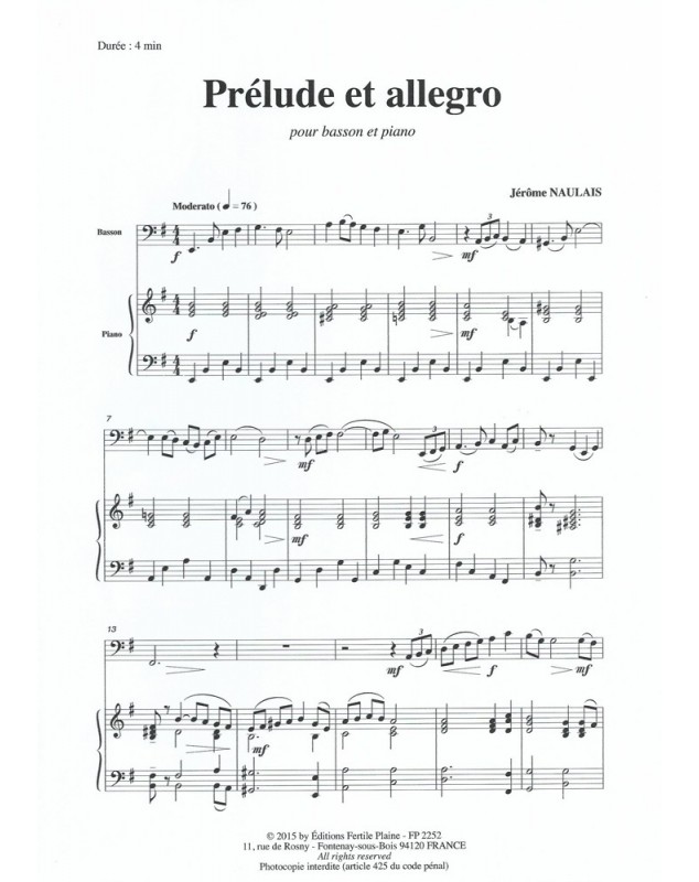 Prélude et Allegro Jérôme Naulais Basson et Piano Recueil + Partition