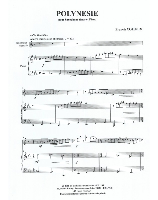 Polynesie Francis Coiteux Saxophone Ténor et Piano Recueil + Partition