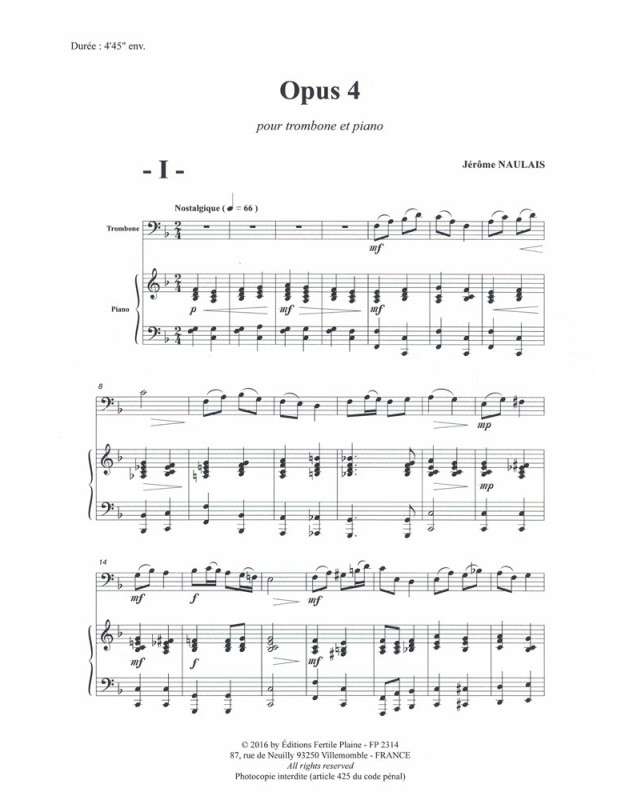 Opus 4 Jérôme Naulais Trombone et Piano Recueil + Partition