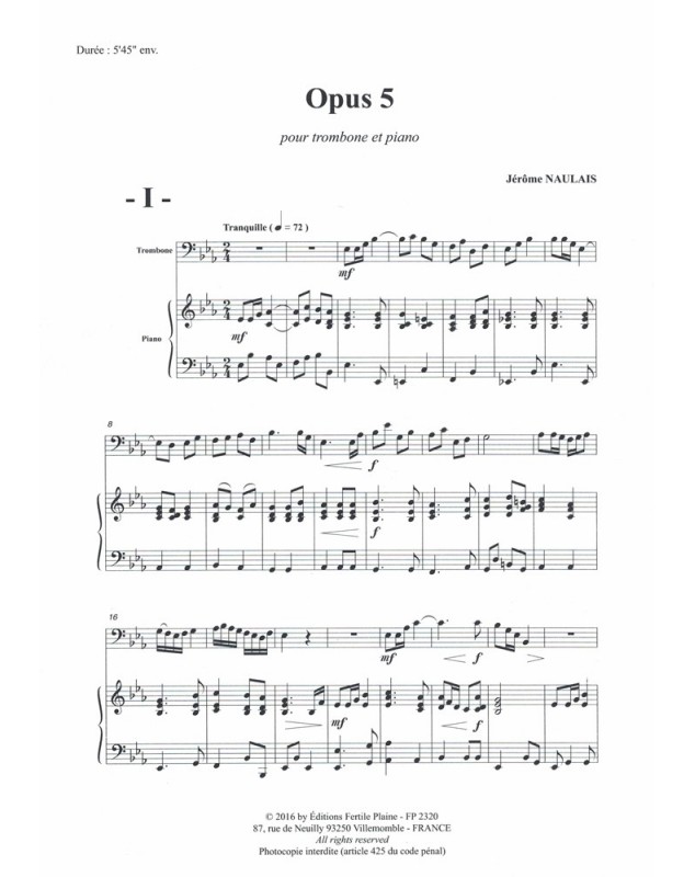 Opus 5 Jérôme Naulais Trombone et Piano Recueil + Partition