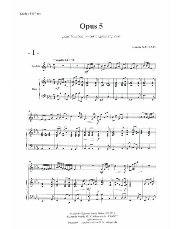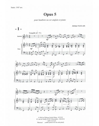 Opus 5 Jérôme Naulais Hautbois et Piano Recueil + Partition
