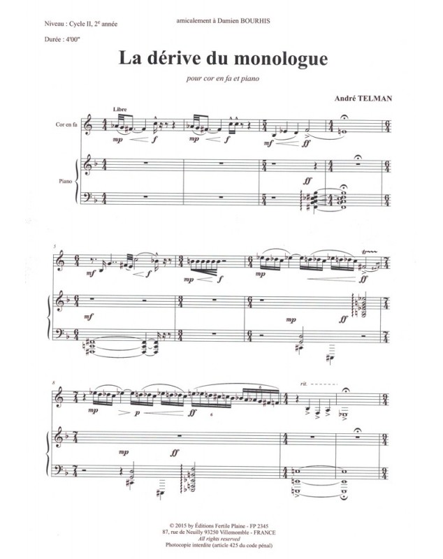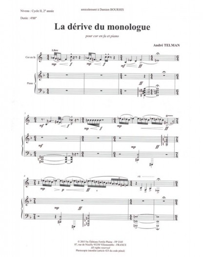 La Dérive Du Monologue André Telman Cor et Piano Recueil + Partition