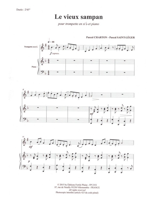 Le Vieux Sampan Pascal Saint-Leger Trombone et Piano Recueil + Partition
