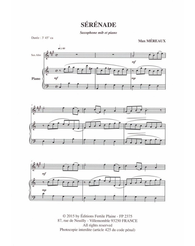 Sérénade Max Mereaux Saxophone Alto et Piano Recueil + Partition