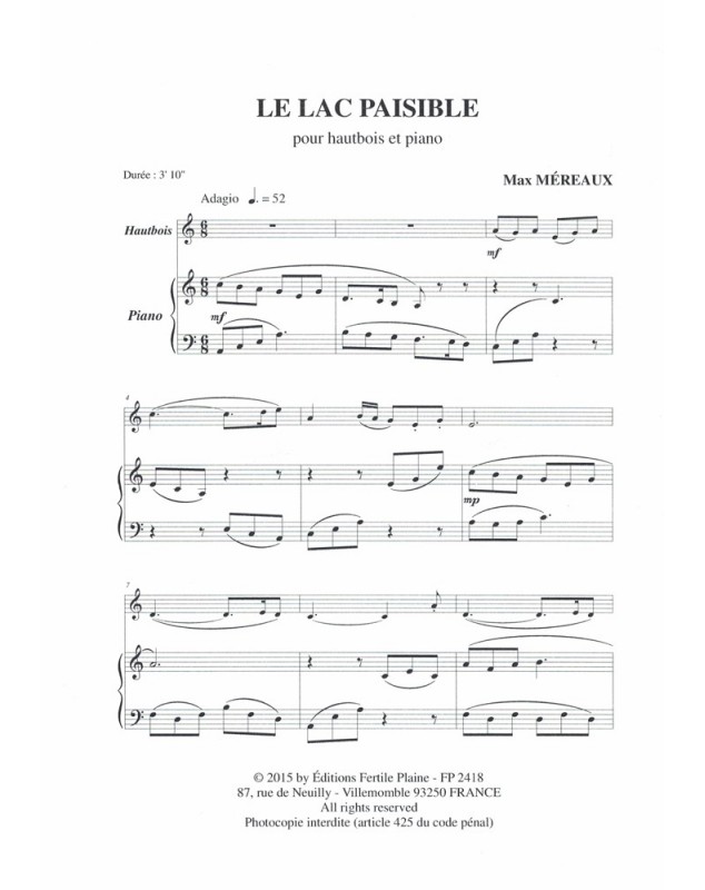Lac Paisible Max Mereaux Hautbois et Piano Recueil + Partition