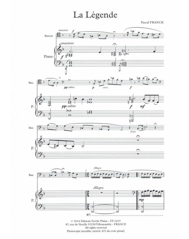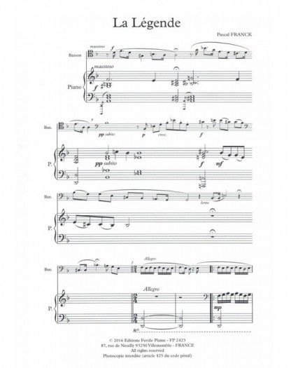 La Légende Pascal Franck Basson et Piano Recueil + Partition