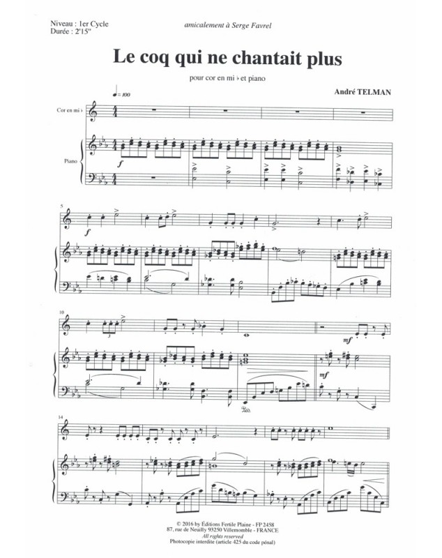 Le Coq Qui Ne Chantait Plus Mi b André Telman Cor et Piano Recueil + Partition