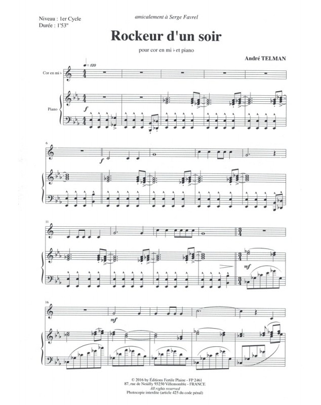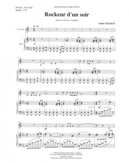Rockeur D'un Soir Mi b André Telman Cor et Piano Recueil + Partition