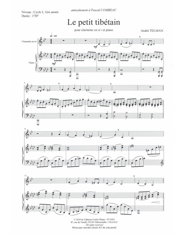 Le Petit Tibétain André Telman Clarinette et Piano Recueil + Partition