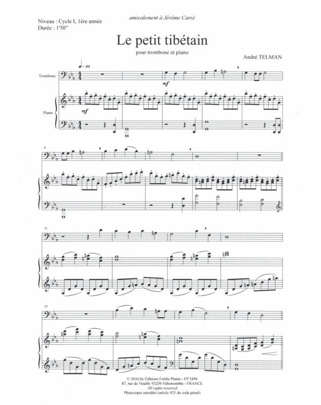 Le petit tibétain Andre Telman Trombone et Piano Recueil + Partition