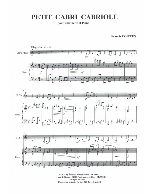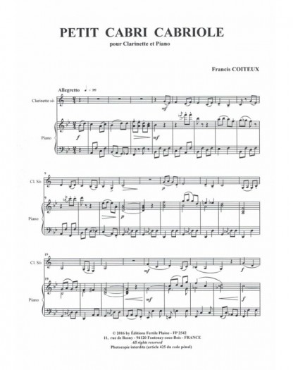 Petit Cabri Cabriole Francis Coiteux Clarinette et Piano Recueil + Partition