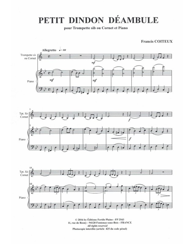 Petit Dindon Déambule Francis Coiteux Trompette et Piano Recueil + Partition