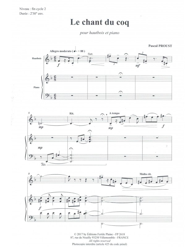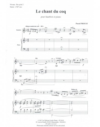 Le Chant Du Coq Pascal Proust Hautbois et Piano Recueil