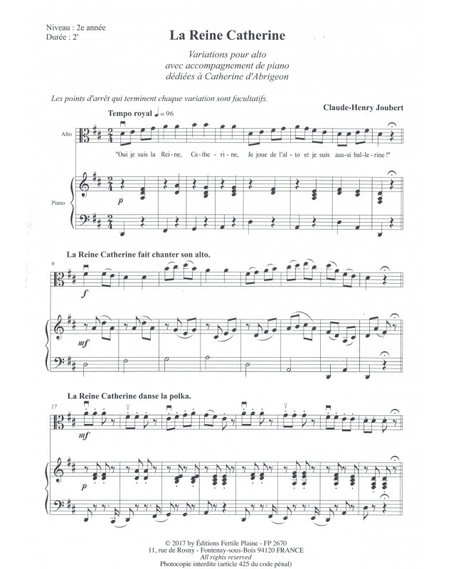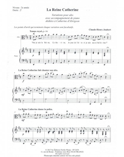 La Reine Catherine Claude-Henry Joubert Alto et Piano Recueil + Partition
