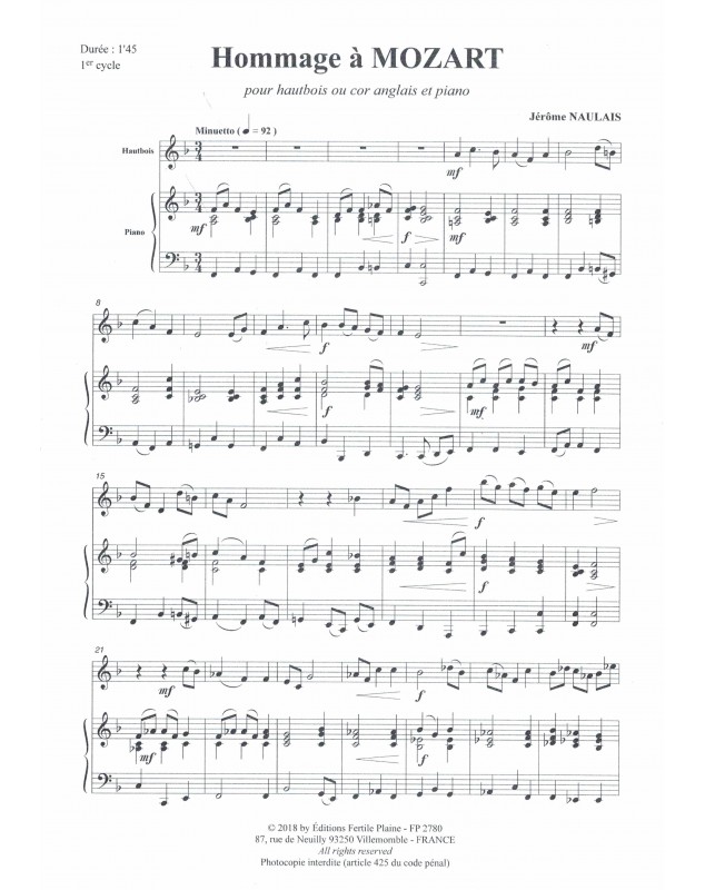 Hommage À Mozart Jérôme Naulais Hautbois et Piano Recueil