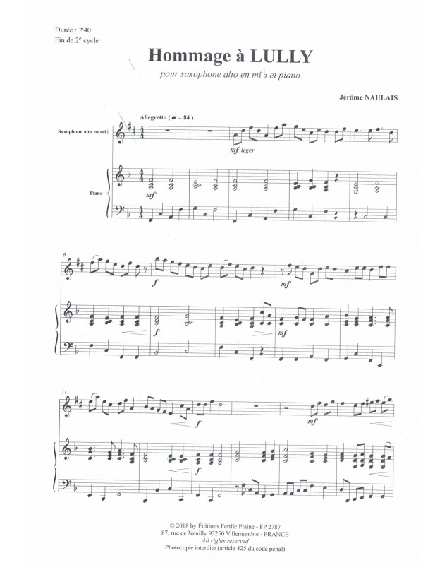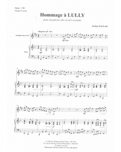 Hommage À Lully Jérôme Naulais Saxophone et Piano Recueil