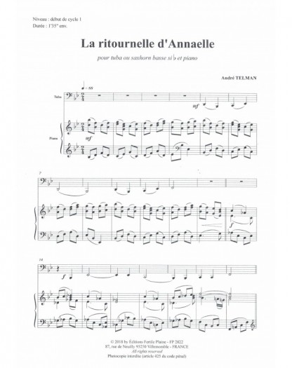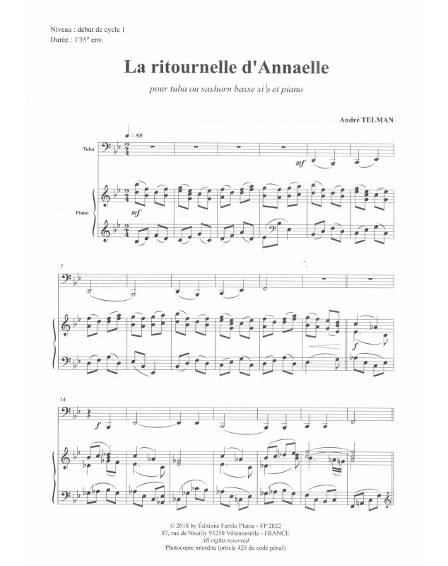 Ritournelle Pour Annaëlle André Telman Tuba et Piano Recueil