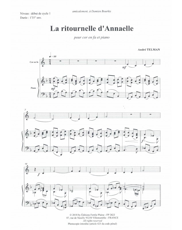 Ritournelle Pour Annaëlle André Telman Cor et Piano Recueil