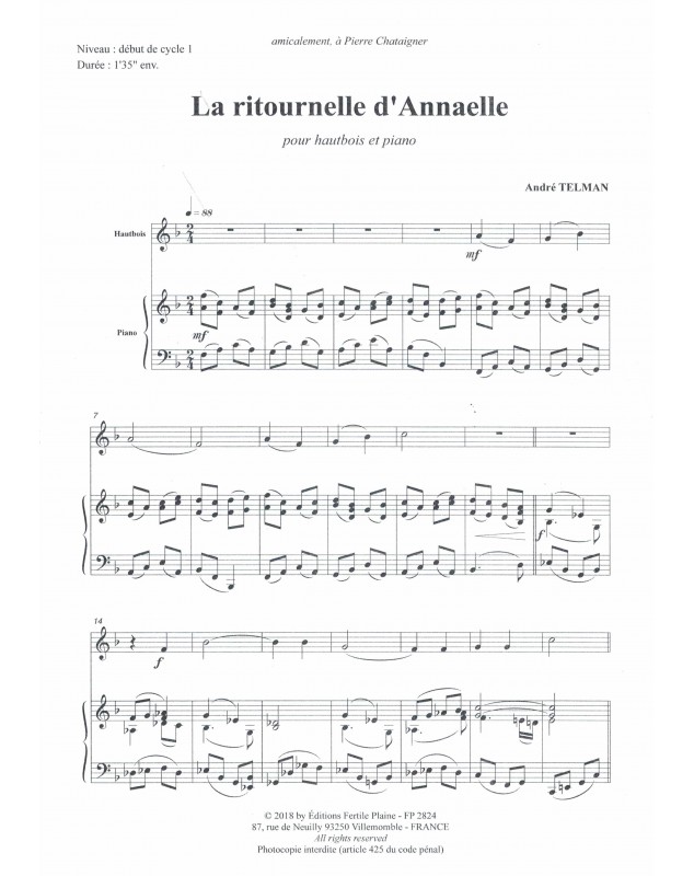 Ritournelle Pour Annaëlle André Telman Hautbois et Piano Recueil