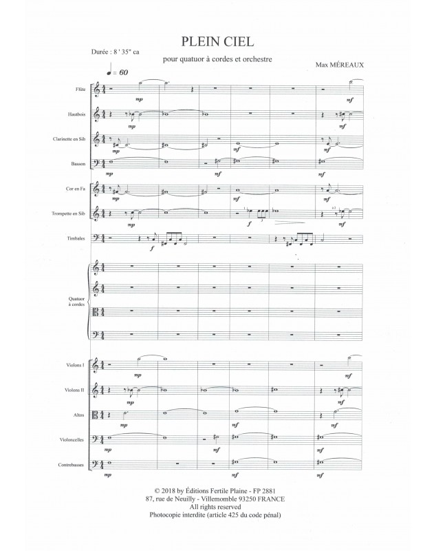 Plein Ciel Max Mereaux String Quartet and Orchestra Score + Parties