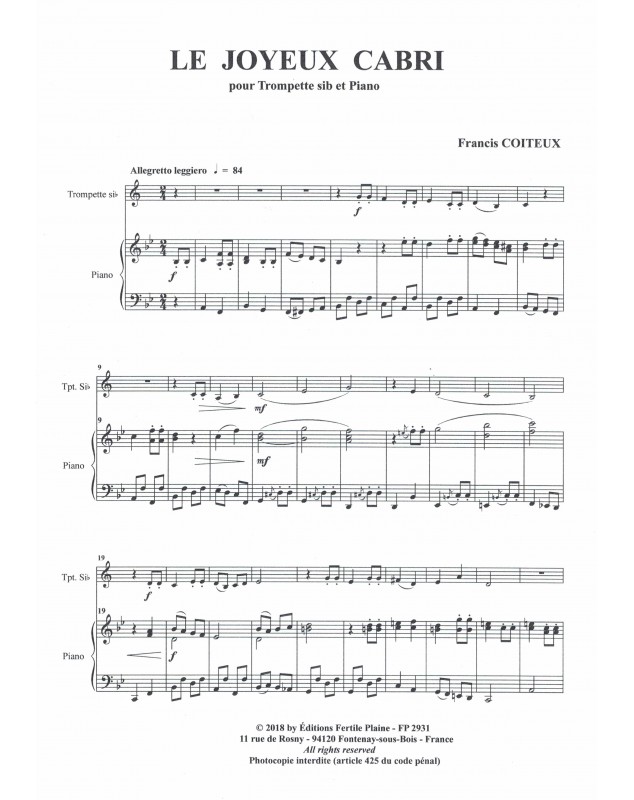 Le Joyeux Cabri Francis Coiteux Trompette et Piano Recueil